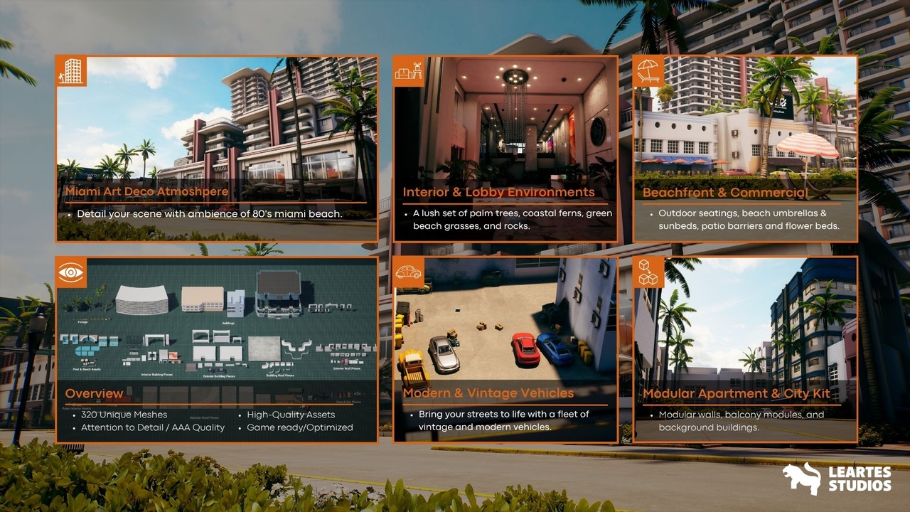 Жилой комплекс Miami Vice City с более чем 300 уникальными сетками. Окунитесь в яркую атмосферу и ретро-современную роскошь залитого солнцем мегаполиса. Этот обширный набор позволяет создавать реалистичные городские побережья с культовой архитектурой в стиле ар-деко в пастельных тонах, модульными витринами и высотными жилыми комплексами.